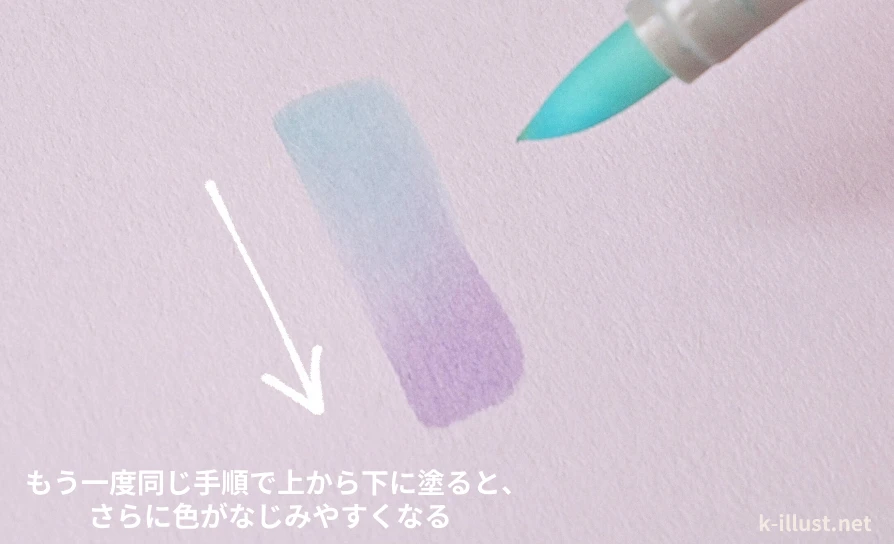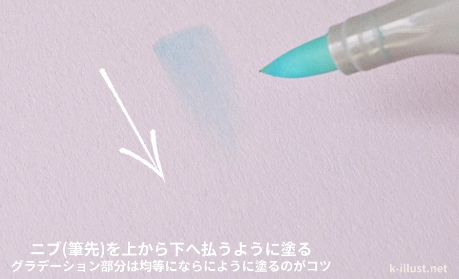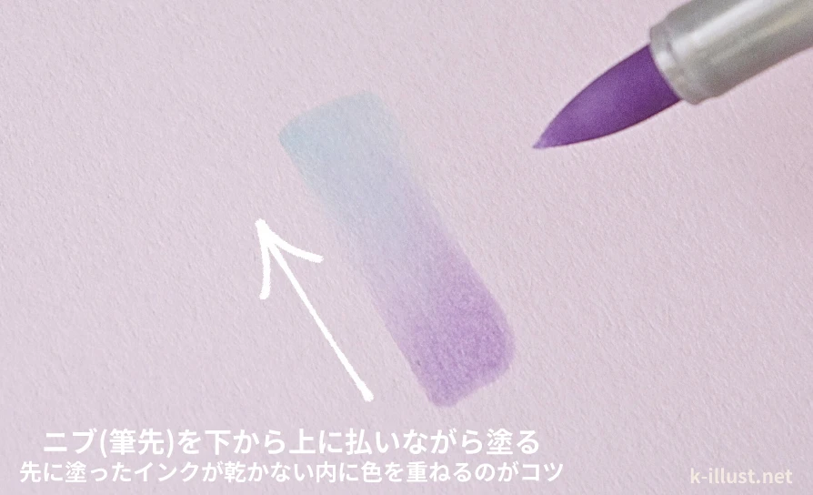 次に、グラデーションさせたい色のニブを下から上に払うように塗ります。