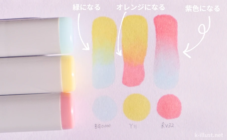 選んだ色の反対側にある色を補色といいます。補色でのグラデーションは色がにごりやすく、色同士をなじませるのも難しいです。