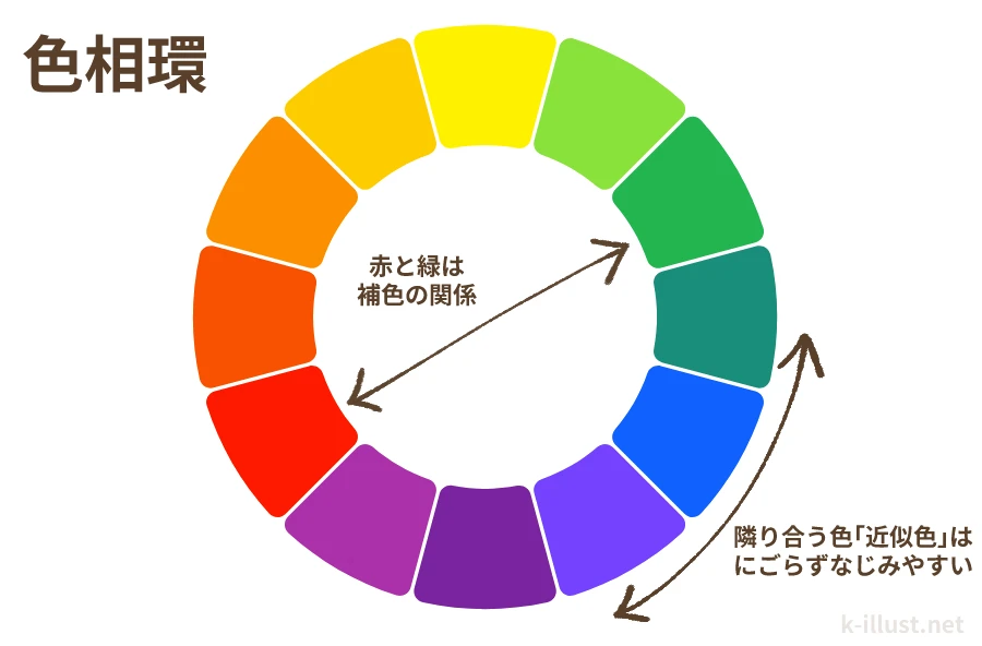 何故かというと、色相環で見ると、赤と緑って結構かけ離れた色なんです。