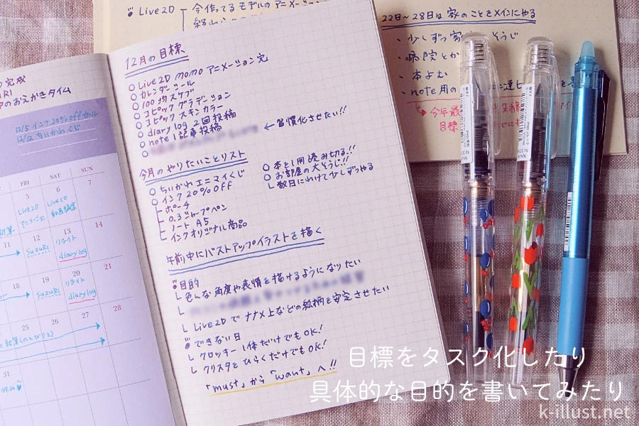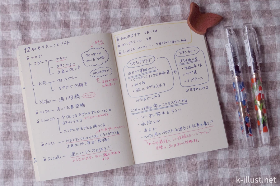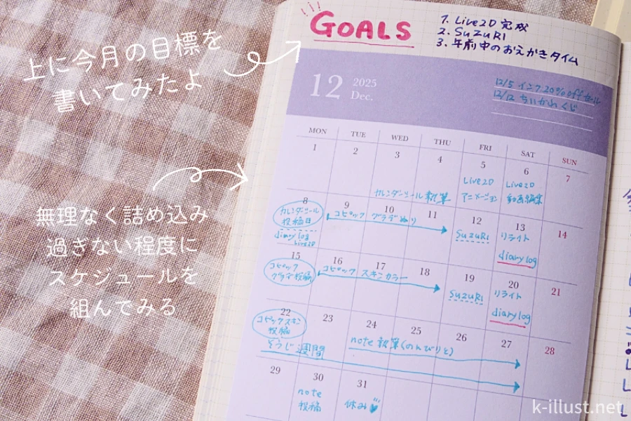 そしてメモ帳に書いたやりたいことリストを見ながら、今度は「ほぼ日の方眼ノート」に今月の目標を書いて、スケジュールを組んでいきます。