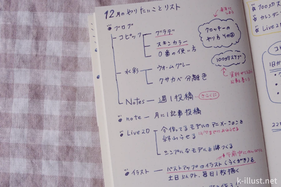 右側のページには、先ほどダイソーのノートに書いた目標をリスト化(タスク化)しました。目標をクリアしたらチェックを付けて達成感を味わえるようにしてます。
