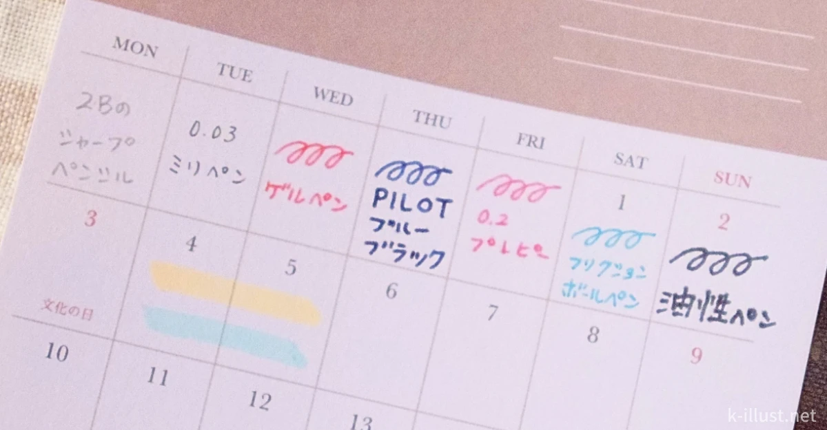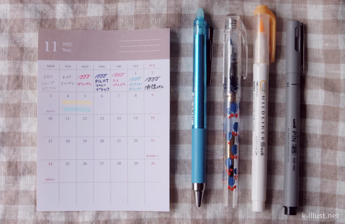 もう過ぎ去ってしまった2025年11月のカレンダーシールを活用すべく、紙とペンとの相性を調べてみました。