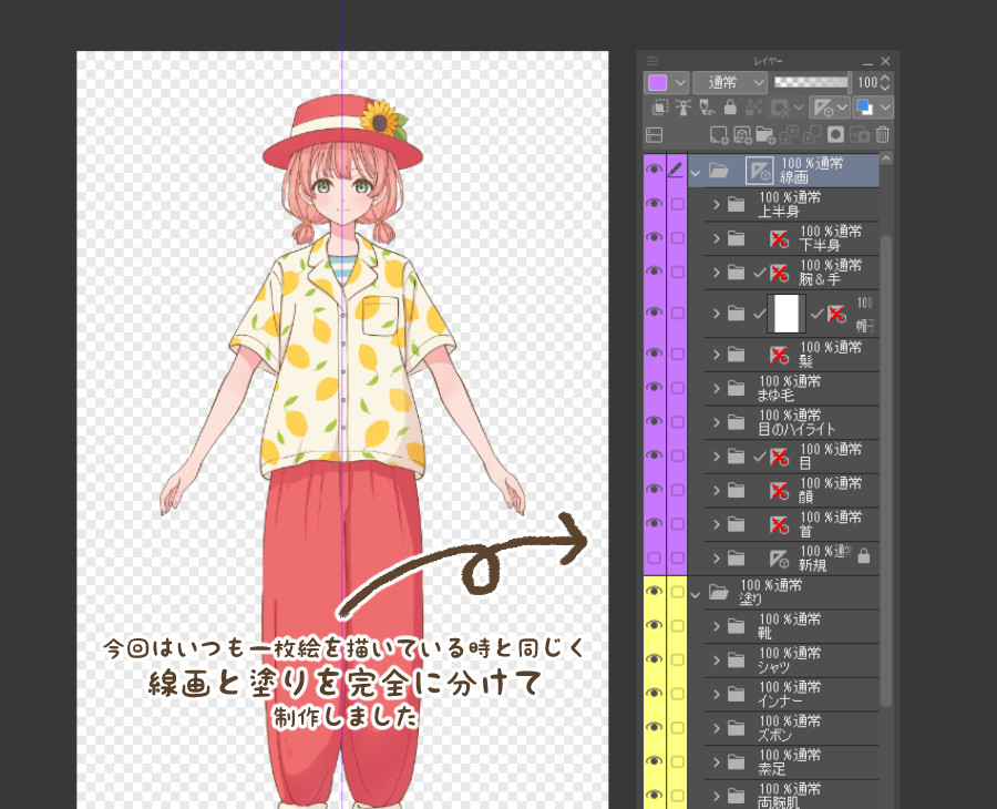 今回自分で絵を描いたので違っていても問題にはなりませんが、イラストレーターさんから頂いた絵の場合、勝手に色やデザインを変えられてしまうとトラブルになるので原画ファーストでパーツ分けを完了させます。何があろうと原画が正義です!
