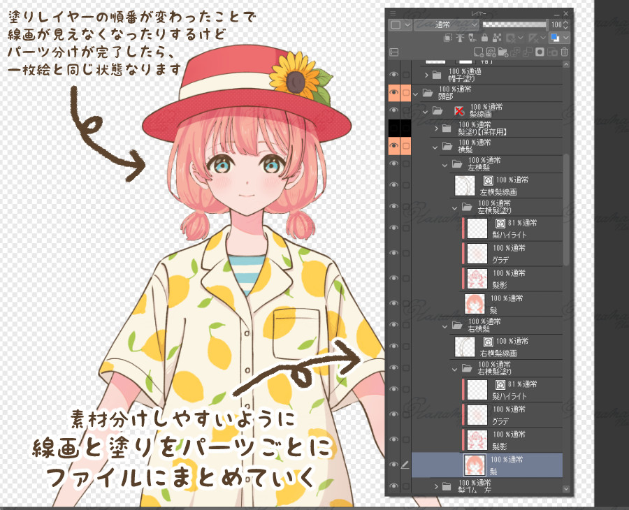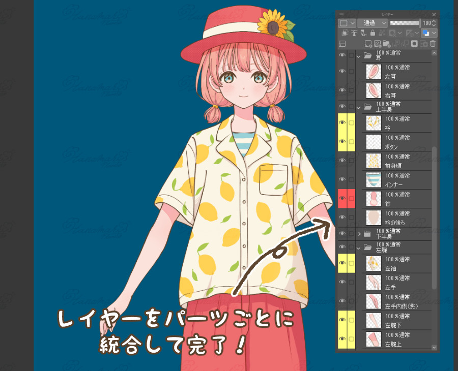 そして原画と相違がなければ素材分けしたパーツごとにレイヤーを結合します。