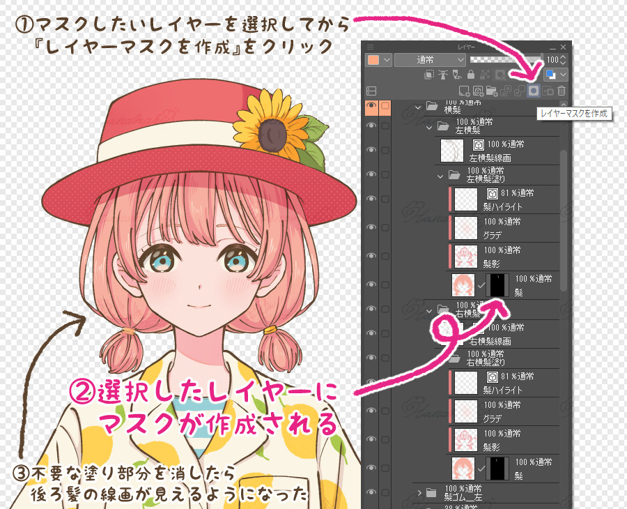 そもそもマスクってなんやねんって方はクリスタ公式サイトの『レイヤーマスク』の記事を読んでみてください。