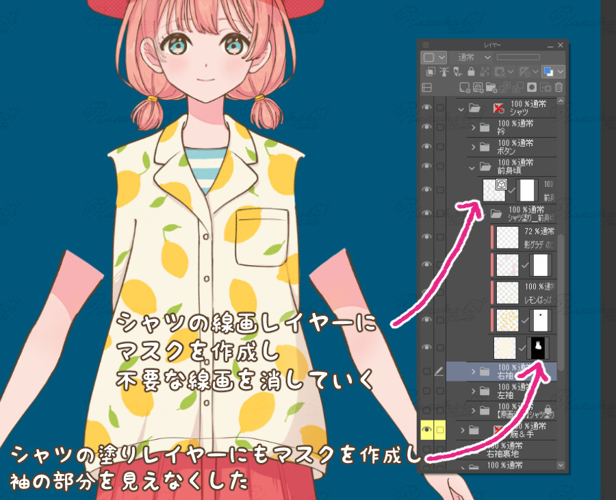 シャツの塗りは袖も衿もすべて一枚のレイヤーでしたが、マスクで袖の線画と塗りを見えなくしました。