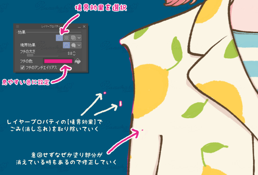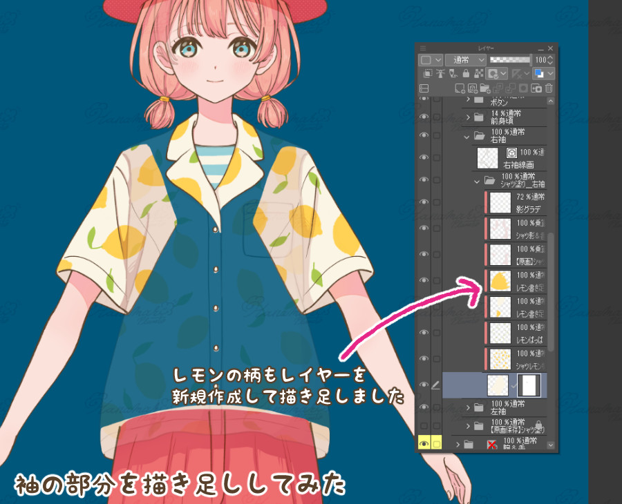 例えば、今回はレモン柄の原画レイヤーの上にレイヤーを新規で作成し、見えない部分のレモン柄を描き足しています。なるべく原画より下に描き足しレイヤーを作った方が良いかと思いますが、今回は緒事情で上に作ってます。