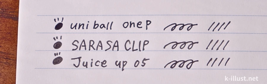 サラサクリップやJuice upよりもインクの乾きが早いので、メモ書きにすごく重宝してます。メモを書いてすぐにノートを閉じれるってすごっ!