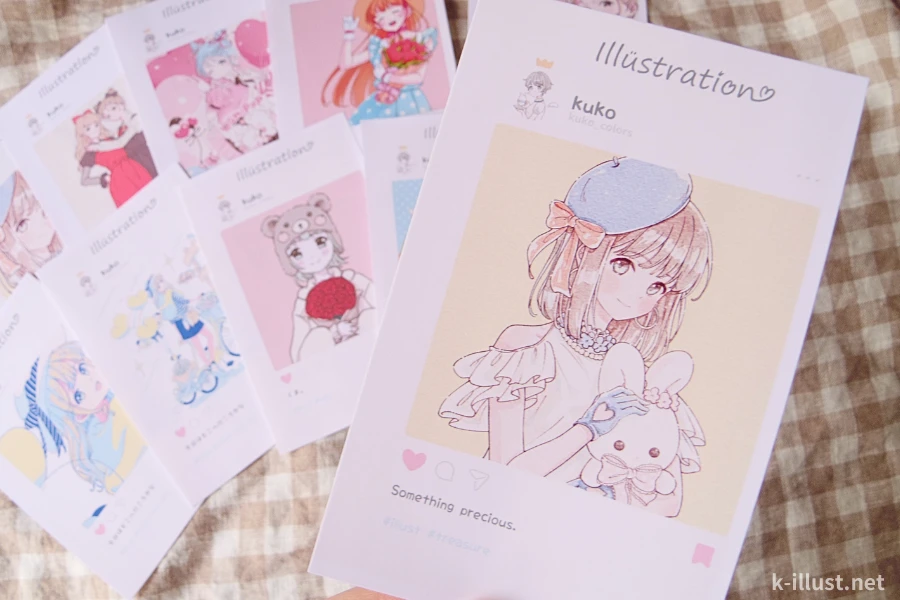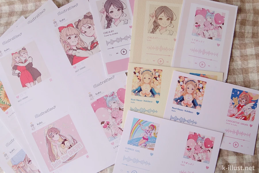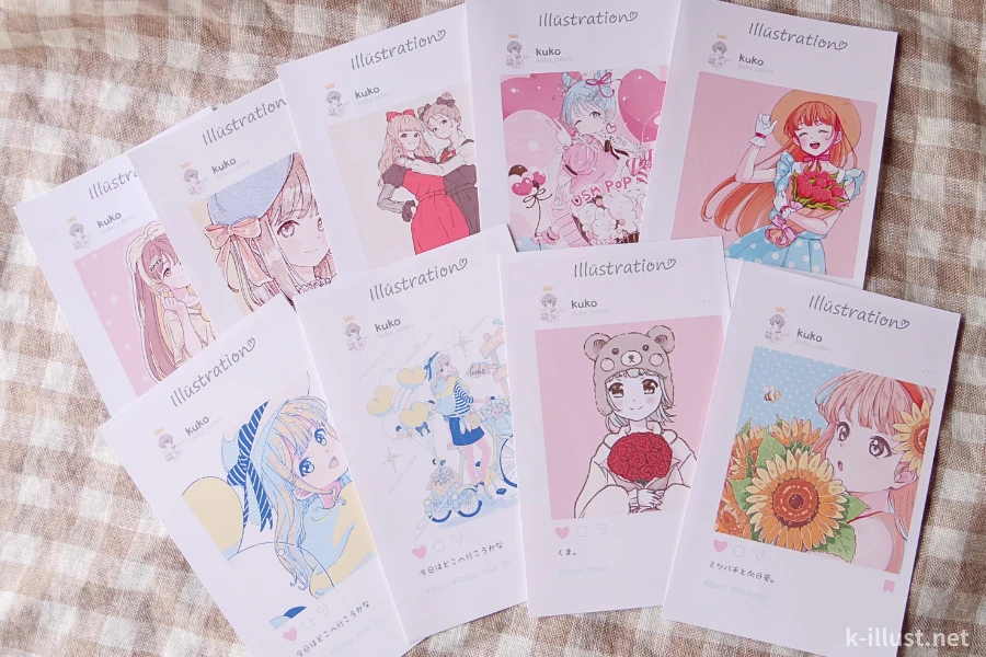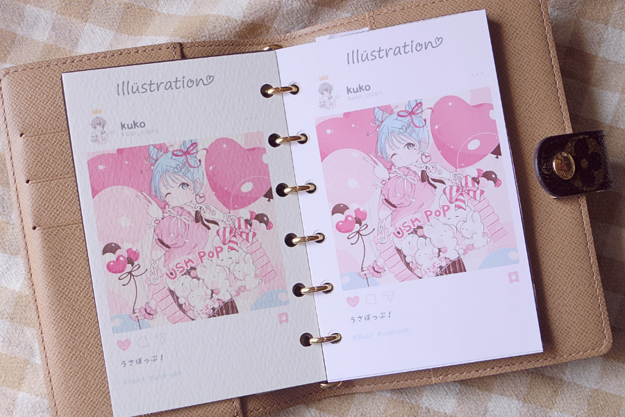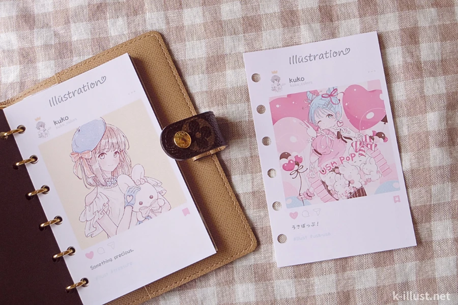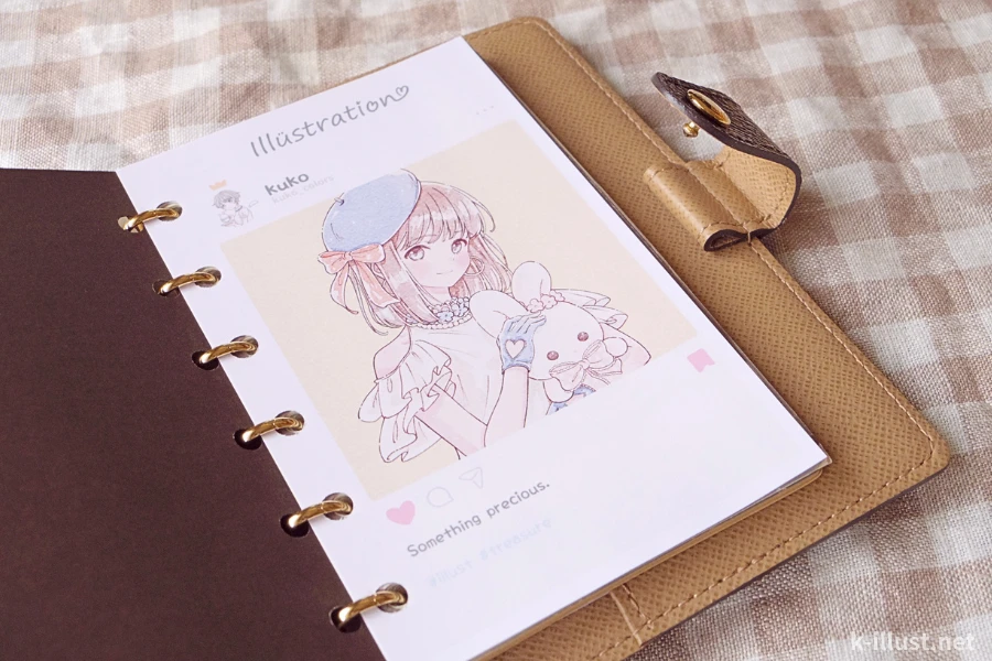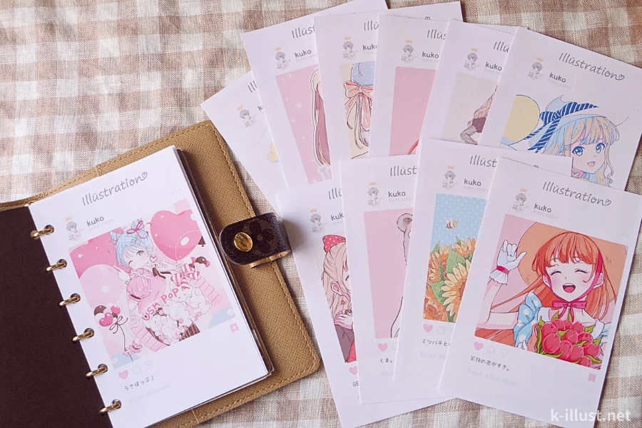 自分用に1冊だけイラスト集を作りたい方なんかは、お好きな市販のバインダーに家庭用プリンターで印刷したイラストをファイリングしてコレクションするのも楽しいと思います。