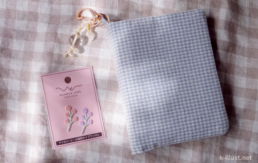 表紙がチェック柄のみでちょっとさみしかったので、手芸屋さんへ行って、かわいいワッペンを買ってきました。